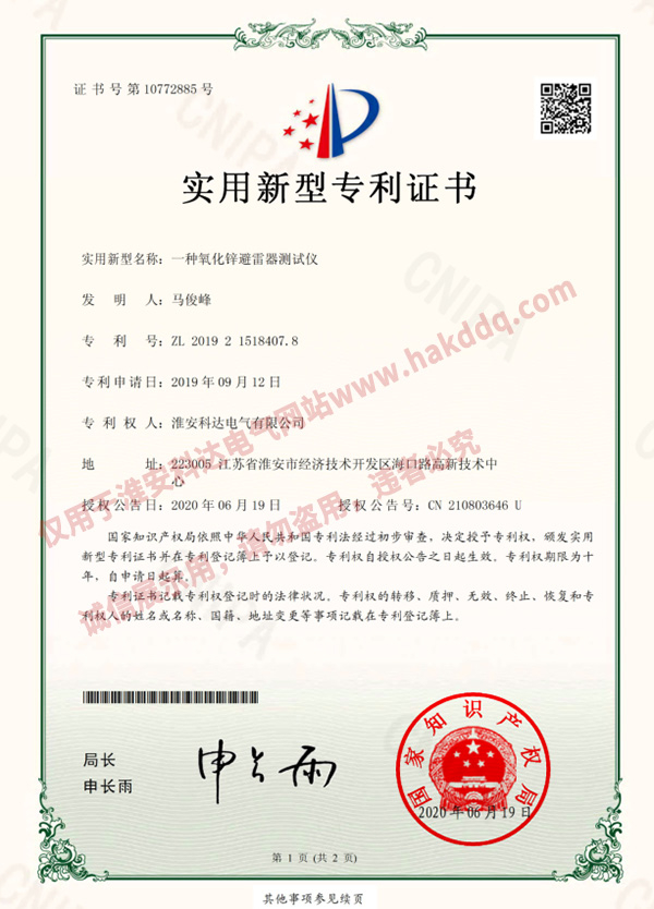 氧化鋅避雷器測試儀專利證書